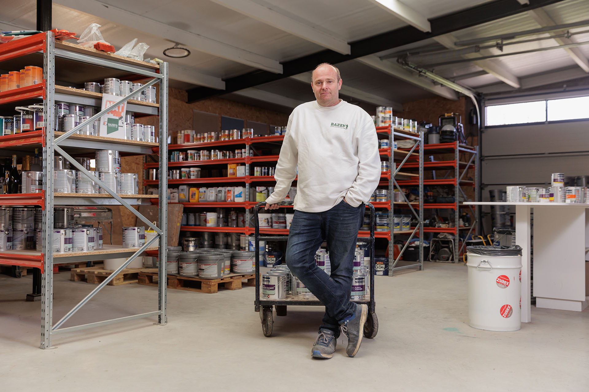 ‘Vroeger stond ik samen met mijn vader Hans dagenlang met een kwast in mijn handen. Tegenwoordig ben ik veel met de bus onderweg. Heerlijk! Dan rijd ik bijvoorbeeld langs de verschillende werken om de schilders van materialen te voorzien. Bezorg ik een steiger of haal ik een hoogwerker op. En ja, dan krijg je soms een vlek op je trui.’